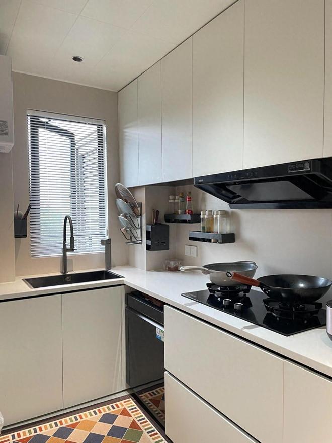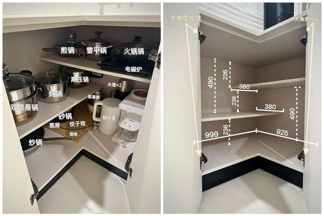 网友@胖虎Viki:奉劝大家,橱柜的转角一定要像我家这样做对开门设计,感觉这块空间就为了收纳各种锅而存在的,用起来超方便,记得柜门搭配165°大铰链。