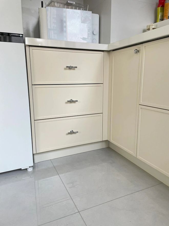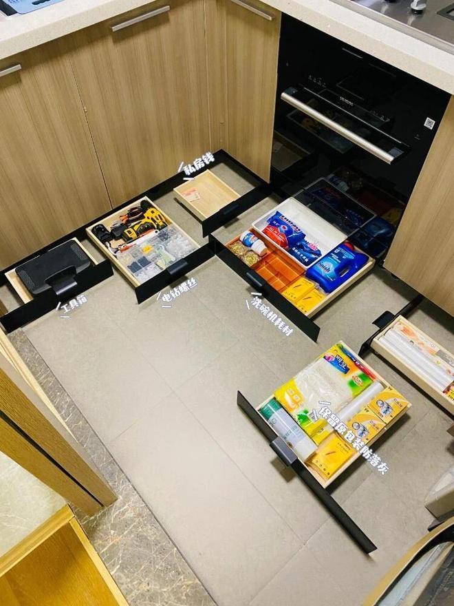众所周知,橱柜的底部一般会有个8~10cm高的扫脚,一是为了防潮,二是为了让我们日常操作时,有一个舒适的伸脚空间。