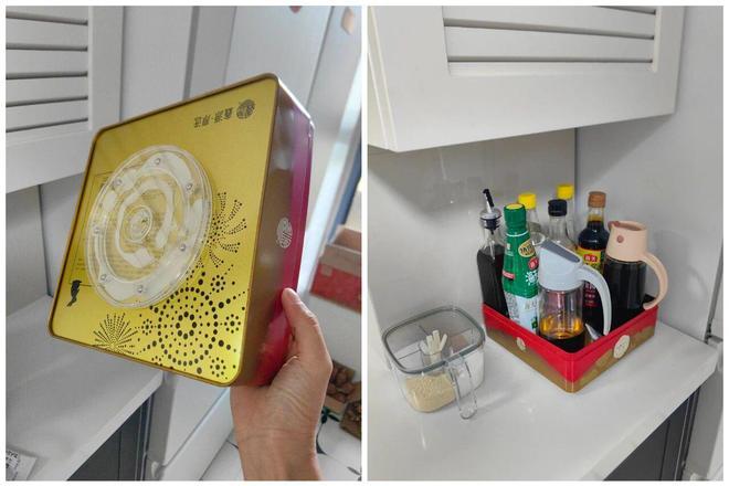 网友@女小王啊:月饼盒家里都有吧,再花2块钱网购一个亚克力转盘底座,一个简单好用的转盘就做好了。用它集中收纳调料整整齐齐,还可以放到柜子里用。
