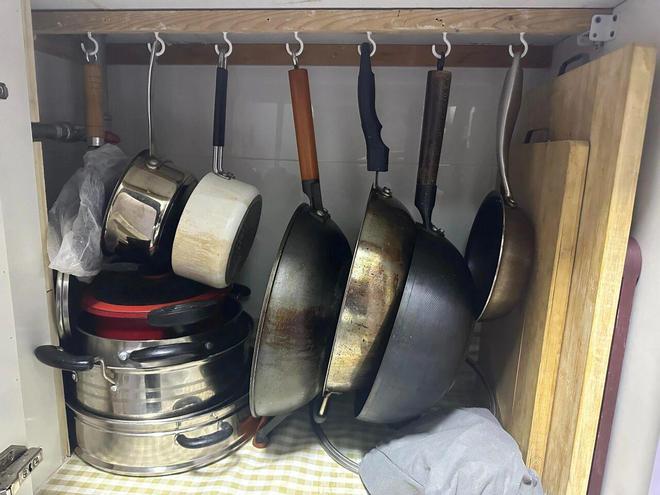 网友@懒床看日出:请忽略我家的几口糊锅,重点是我用一根木条和几个挂钩,就解决了不同锅子的收纳,拿取时一目了然,简单又实用。