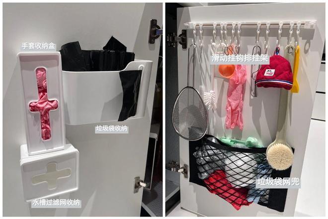 网友@多多:我是把闲置的不锈钢沥水架拆了,再网购了一个挂钩,然后装在柜门背面收纳油布、削皮刀、刷子、保鲜膜等一些小物品,一分冤枉钱都没花。
