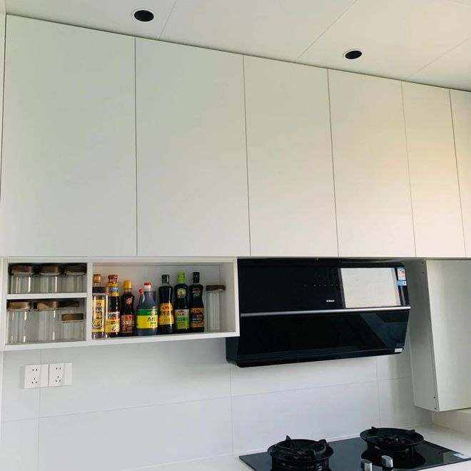 网友@苏小太太:由于个人不喜欢台面有太多杂物,所以装修时就给吊柜加了个开放格专门收纳调料品,既好打理,用起来也特别方便,尺寸是90长*33高*20深。