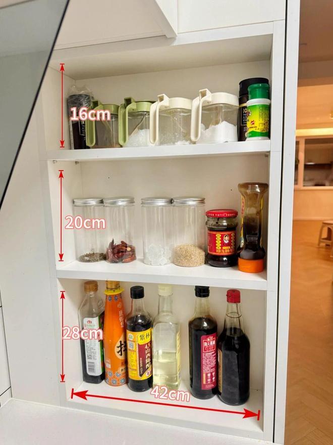 有一点要注意,就是壁龛隔层的高度绝对不能傻乎乎统一,可以借鉴我家的尺寸。毕竟,调料品的高度本身就不一样。