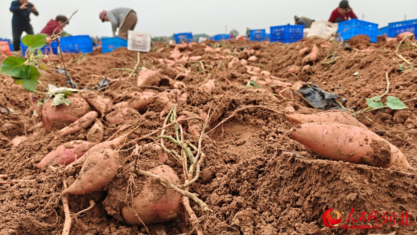 10月下旬,沙河市金沙河红薯岭景区的薯田迎来收成季。红薯杀秧收割机来回络绎,铁犁翻起湿润泥土,一个个红薯顺势滚出。田埂上、薯垄间,乡民们折腰捡拾、分类装筐,一派如火如荼。